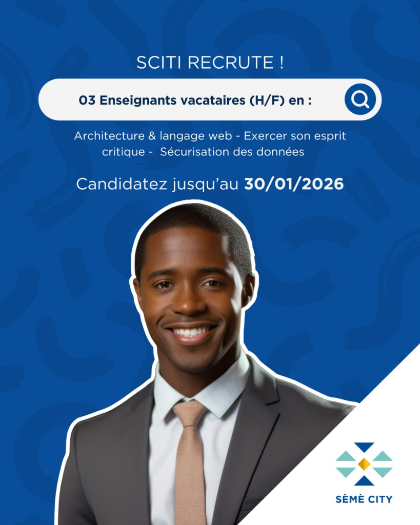 Consultez l’offre complète ici : https://semecity.bj/wp-content/uploads/2026/01/Offre-demploi_Enseignant-vacataire_-Architecture-et-langages-web_SCITI-2.pdf